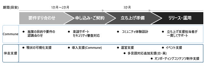 また、プラットフォームの導入からコミュニティの運営までをコミュニティデザイナーが伴走することでフォローし、お客さまの業務プロセスに合わせた的確な導入・分かりやすいコンテンツ作り・適切な運営をワンストップで支援します。