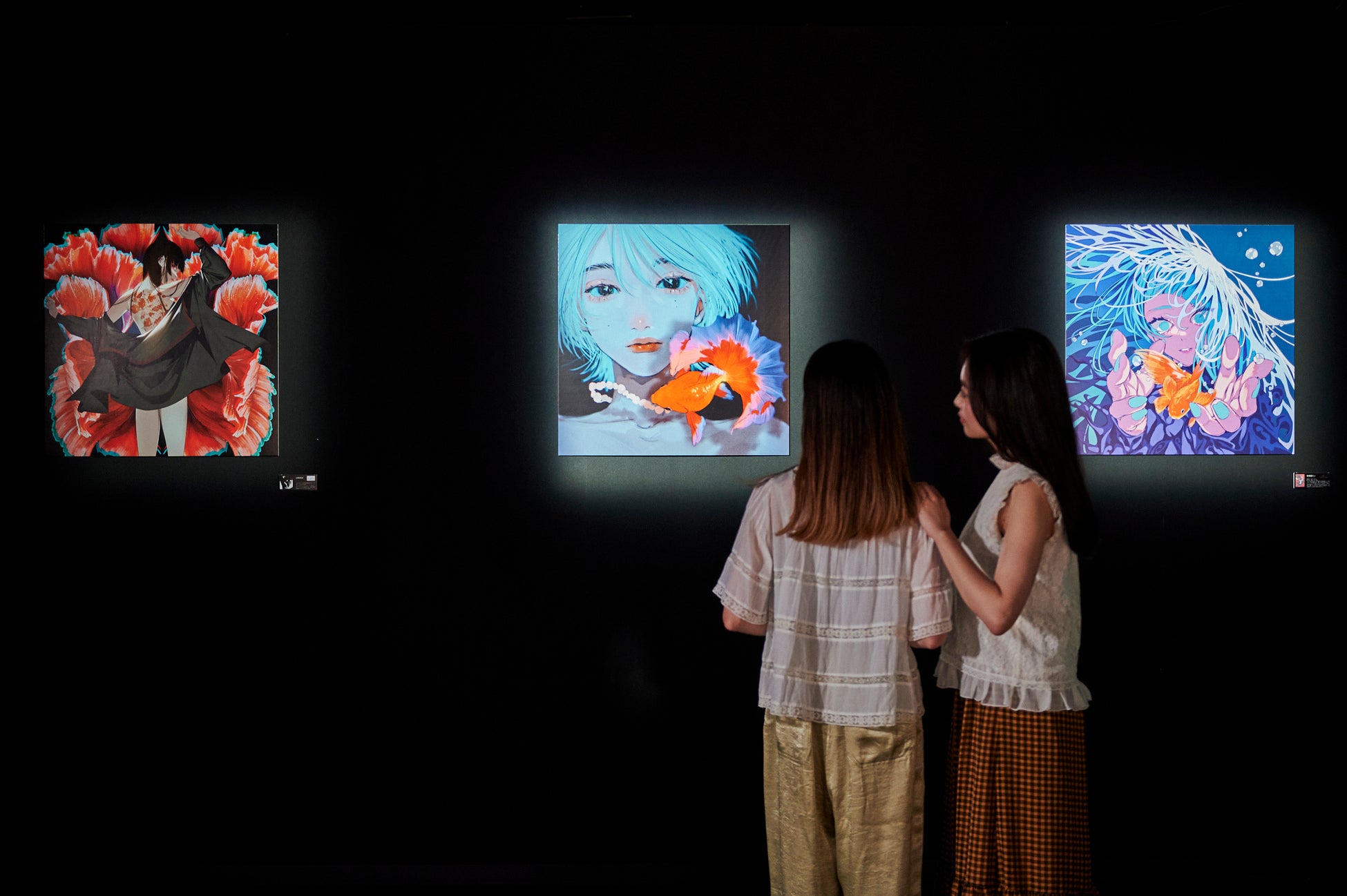 『女性と金魚/鯉』をテーマにしたデジタルアートが並びます。フォロワー40万人を誇り数々の業界とコラボレーションし活躍する「tamimoon」、音楽サービスで大ヒットしたくじら「金木犀 feat. Ado」のMVデザインした「世津田スン」、数々の書籍や音楽コンテンツのイラストを手掛ける「LOWRISE」、MVデザインを手掛けたMAISONdes『ヨワネハキfeat. 和ぬか, asmi』は3600万再生を突破した「NAKAKI PANTZ」、人気ボカロP「wotaku」 の「シャンティ」のMVイラストを手掛ける「亞門弐形」、「高校生イラストコンテスト2019 by pixiv」最優秀賞を受賞作家「ろ樹」など豪華メンバーが勢揃いします。
