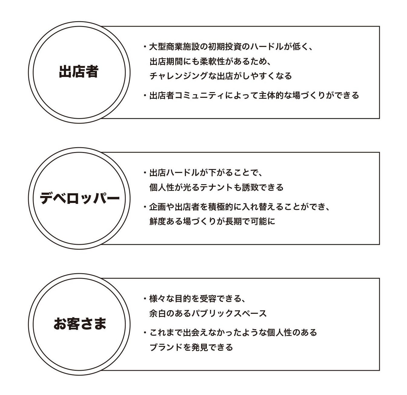 ヤエパブの体験価値の中核を担うのが、「個人性」が光る個人店・路面店の集積です。ヤエスパブリックは①飲食店開業に必要な厨房設備機器をデベロッパー側で企画・設置、②出店期間を柔軟化したことでテナントの出店ハードルが下がり、短期のチャレンジングな出店が可能になります。現在の事業規模にとらわれず、様々な企業やブランドがチャレンジできるモデルを組み立て、徹底的に個人性を重視した店舗集積を実現、出店者・デベロッパー・お客様の3者の共創関係を築ける場を目指しています。