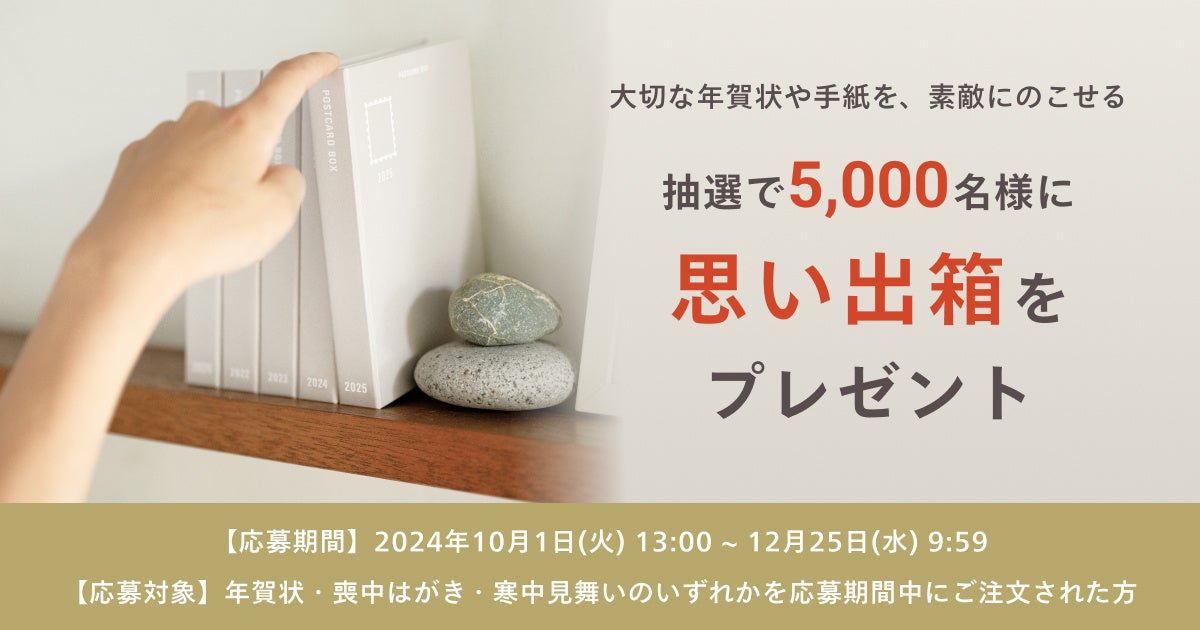 年賀状やお手紙などを保管できるオリジナルの年賀箱「思い出箱」を、しまうま年賀状2025をご注文いただいたお客様の中から、抽選で合計5,000名様にあたるプレゼントキャンペーンを実施いたします。