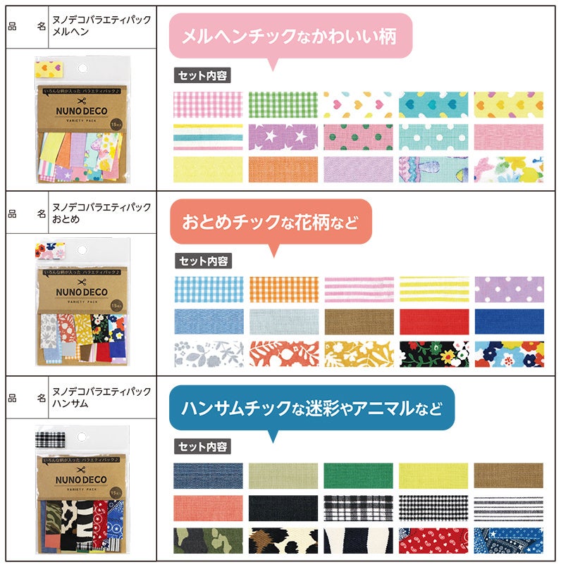 「ヌノデコテープのいろいろな柄を少しずつ使いたい!!」というお客様のお声から登場したヌノデコバラエティパック。