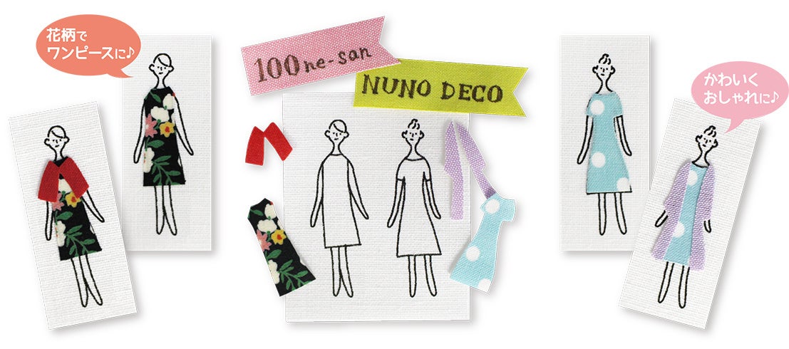 いろいろなヌノデコテープが15枚入った「バラエティパック」は、今、話題の「100ネエサン」のお洋服にちょうどいい長さ。切って貼るだけで、簡単に着せ替えを楽しんでいただけます。ペンや刺しゅうと組み合わせて使うと、100ネエサンの着せ替えの幅がより拡がります。