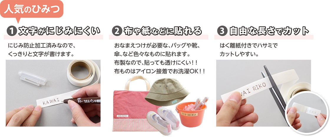 *おなまえつけが必要なバッグや靴、傘などだけでなく、紙などに貼れ、布製なので貼っても透けにくい