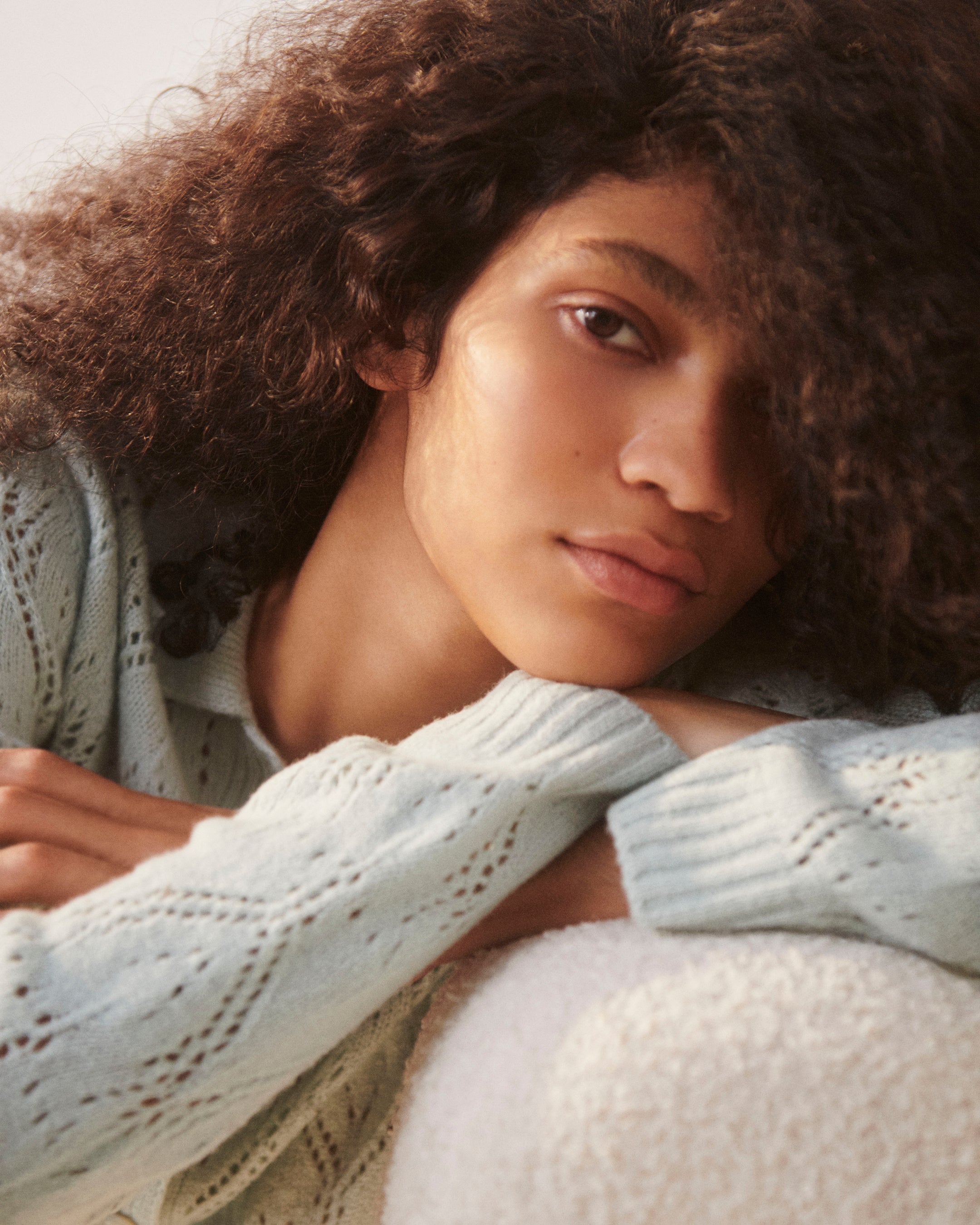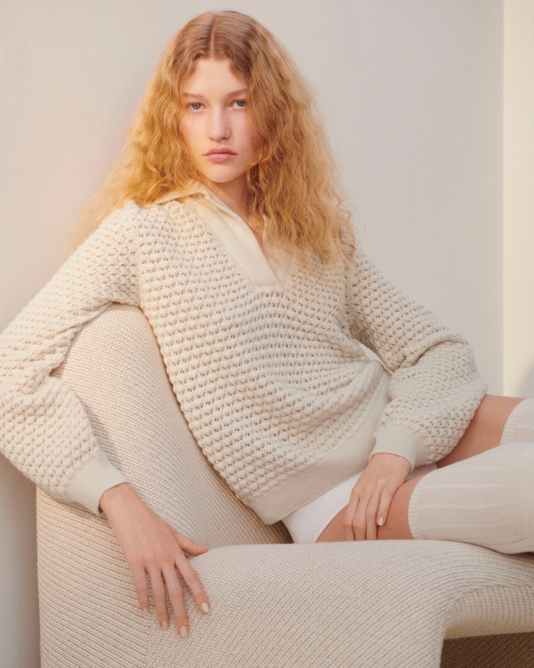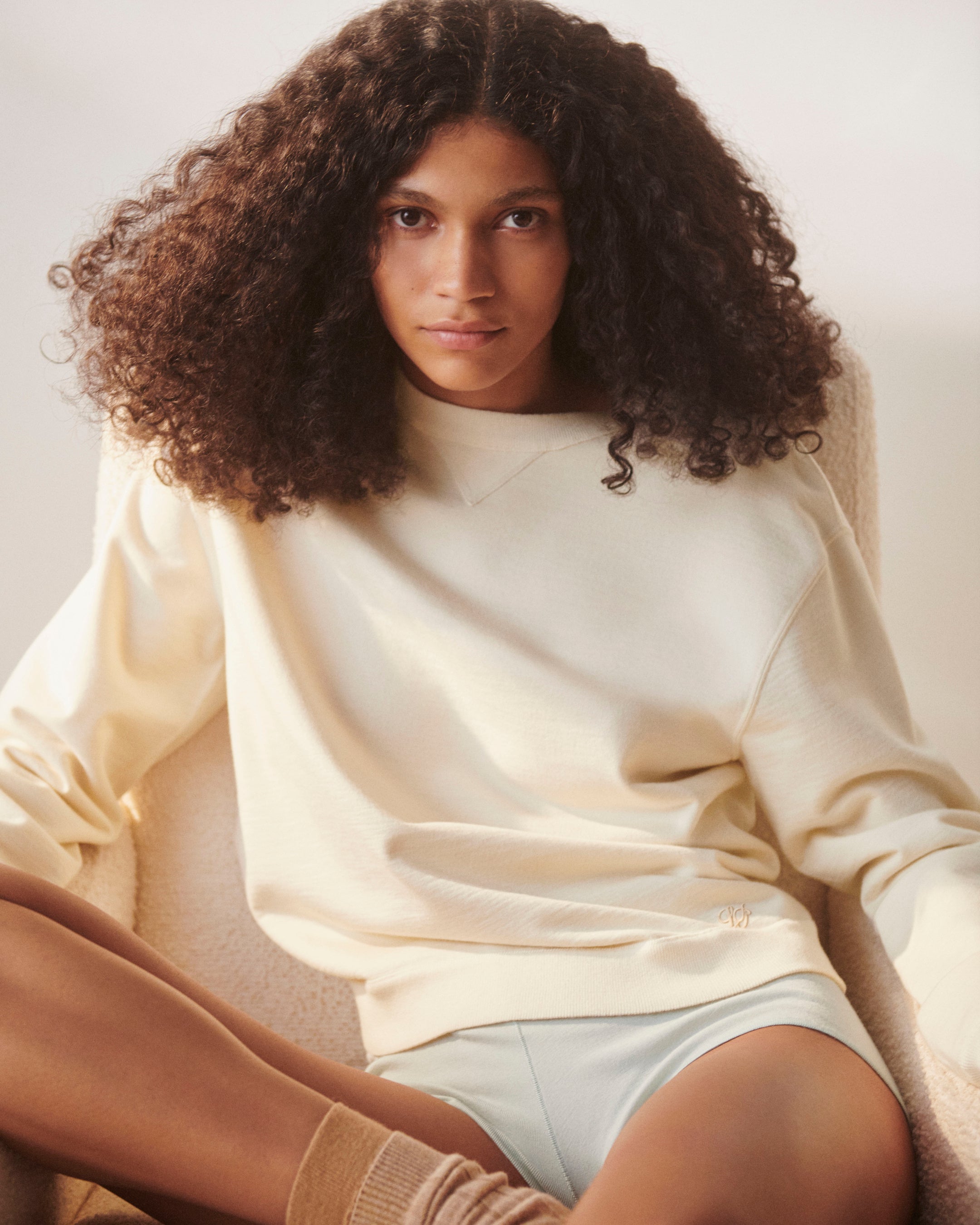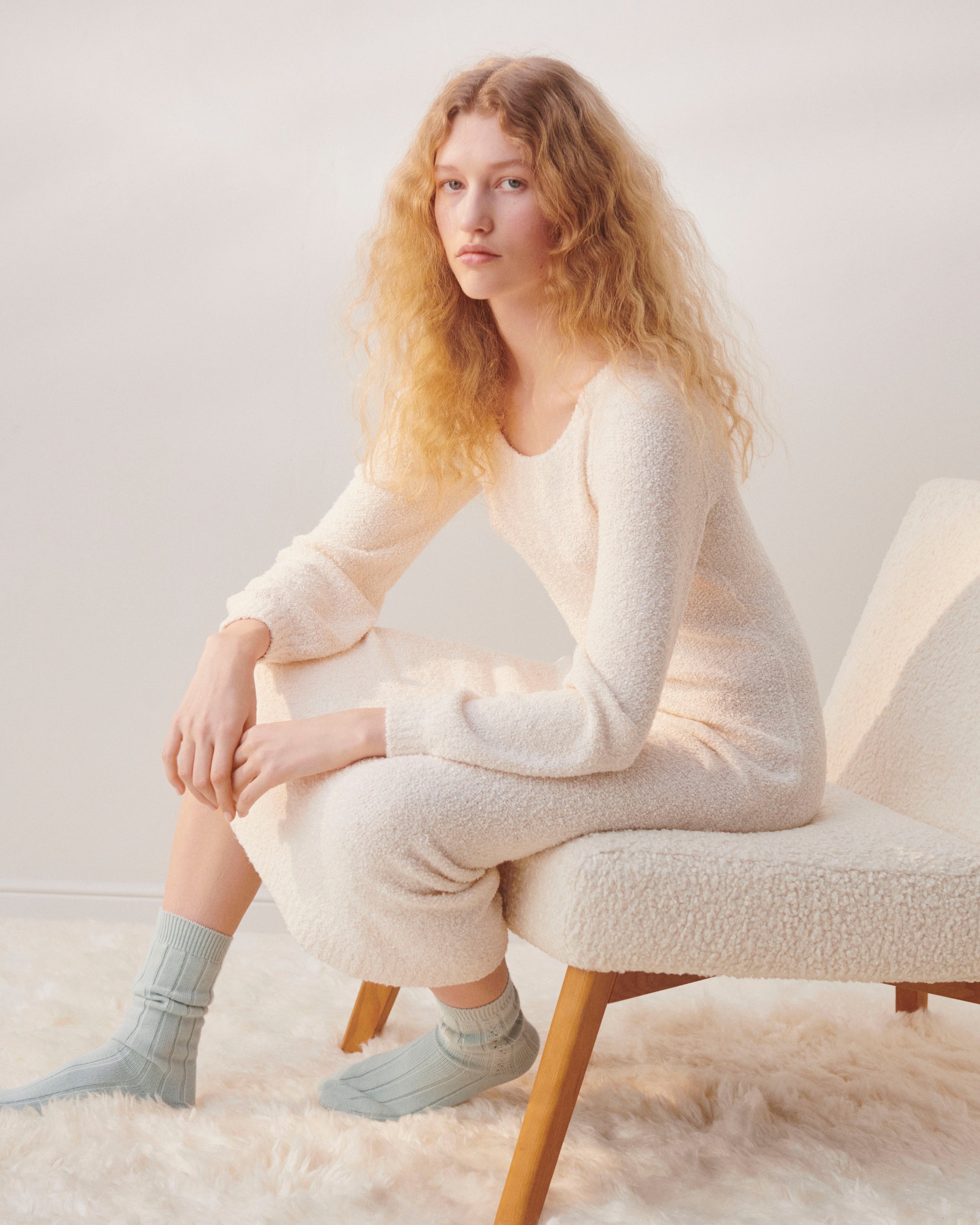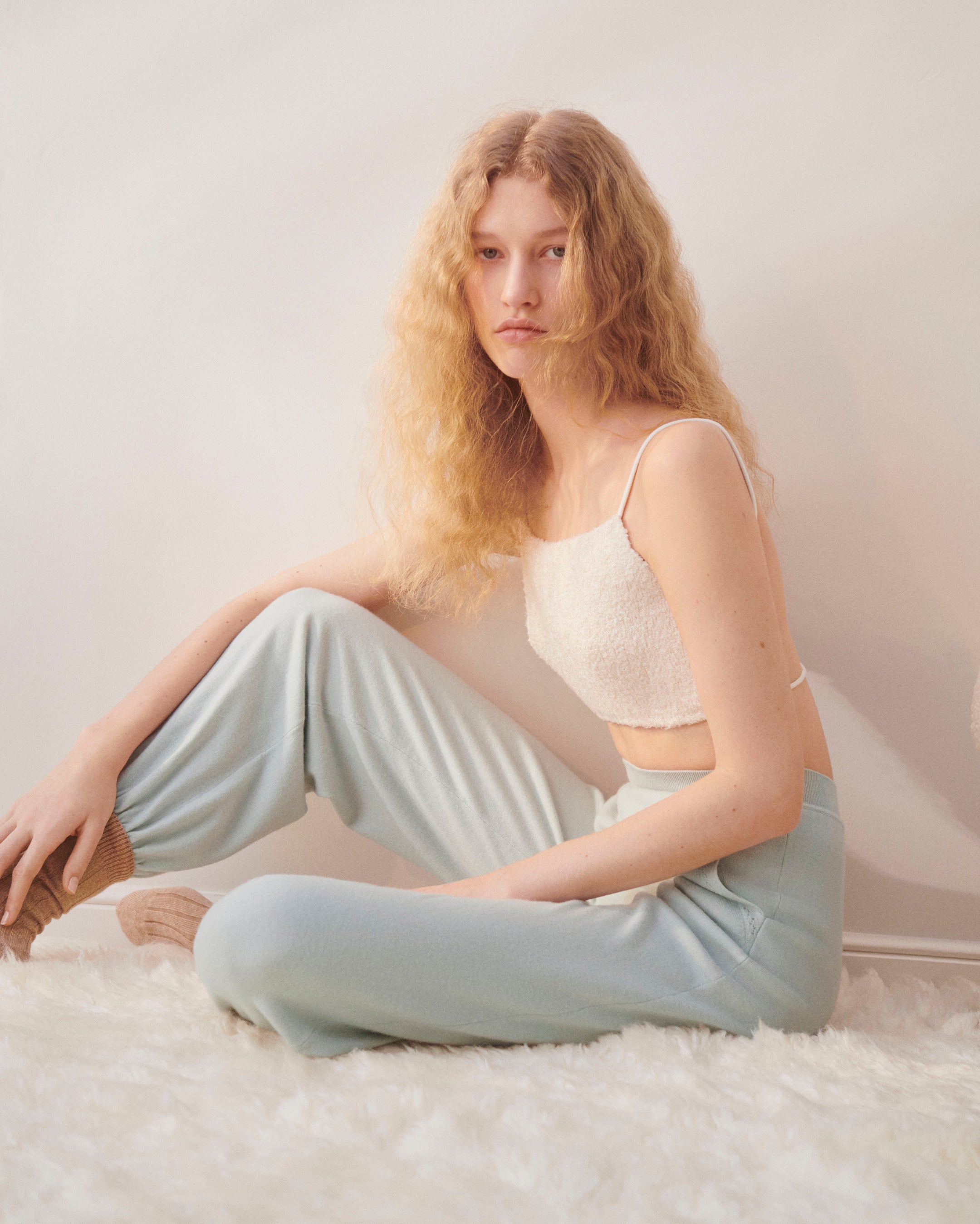 コクーン・コレクションでは、ランジェリーからインスピレーションを得たレースモチーフの、エアリーで繊細なキャッシュシルク素材のタンクトップ、カーディガン、ソックスや、かわいらしいアジュールステッチを施したベビーカシミヤのアイテムも展開。暖かい季節には、天然のコットンとカシミヤの糸を使用した、驚くほど柔らかくて軽量なパンツやスウェットシャツがぴったりです。