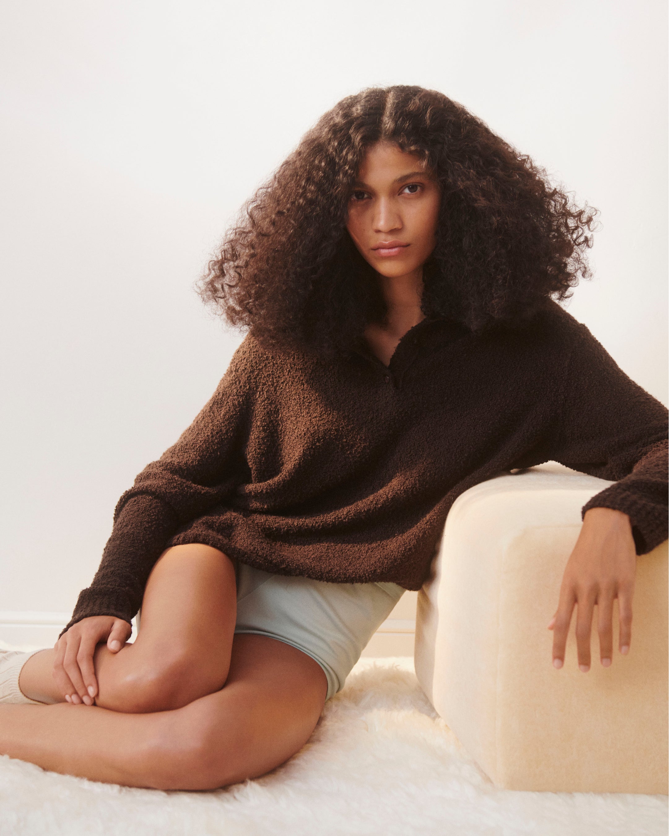 例えば、柔らかなピュアシルクのブークレ・ニットのロングスリーブドレスは、ウエストはストレートで裾に向かってわずかにフレアになっているため、おうち時間にもカジュアルな集まりにも最適です。同じくブークレ・ニットでは、ショート丈のジャンプスーツ、トップス、ショートパンツ、ストレートフィットのポロシャツが展開されます。サイドスリットとすっきりとしたショルダーがアクセントとなり、着心地の良さを際立たせています。