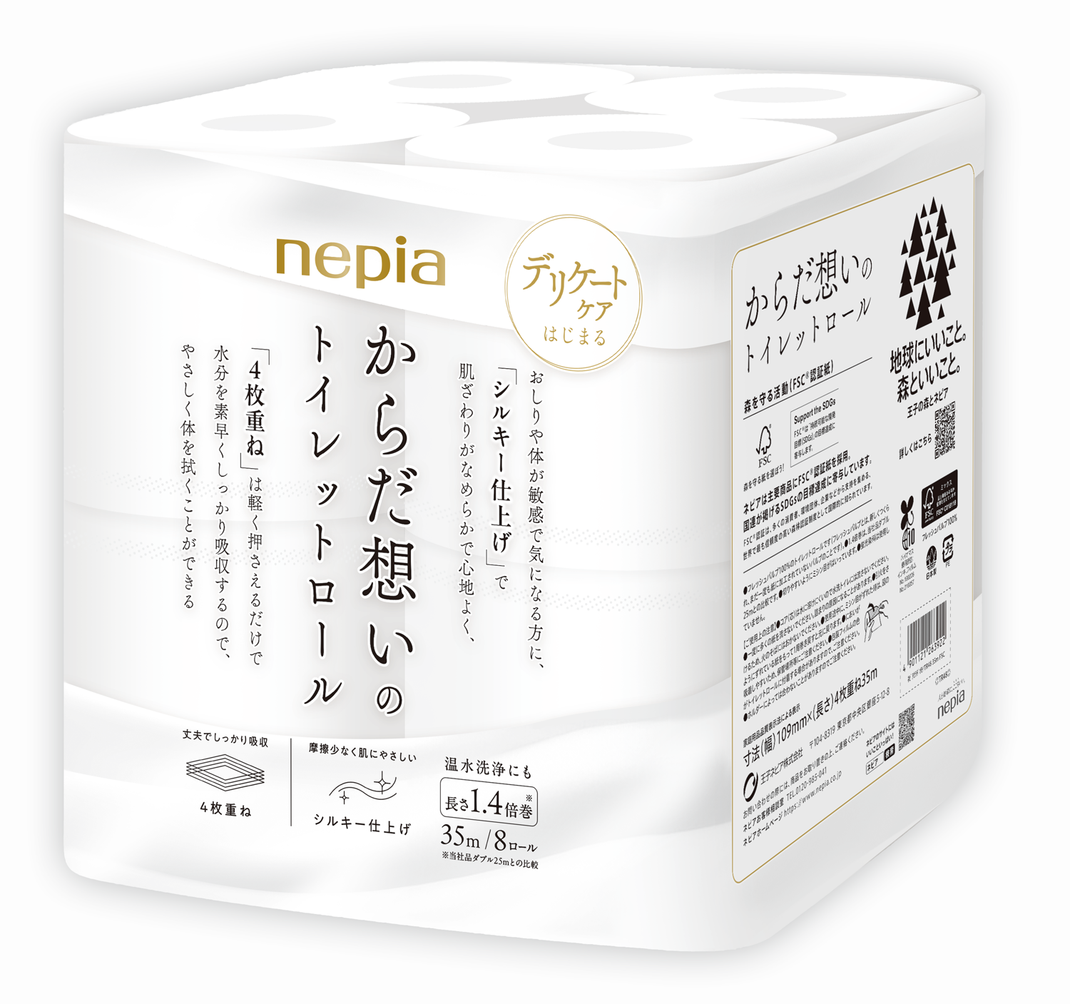 王子ネピア株式会社(本社:東京都中央区、代表取締役社長:森平高行)は、当社初となる「4枚重ね」の高い吸水力と、摩擦が少なくなめらかな使い心地の「シルキー仕上げ」で、生理中や下痢、痔などのお悩みを抱えるデリケートなお肌に寄り添う“デリケートケアトイレットロール”「からだ想いのトイレットロール」を7月26日(金)より各種オンラインストアで発売いたします。