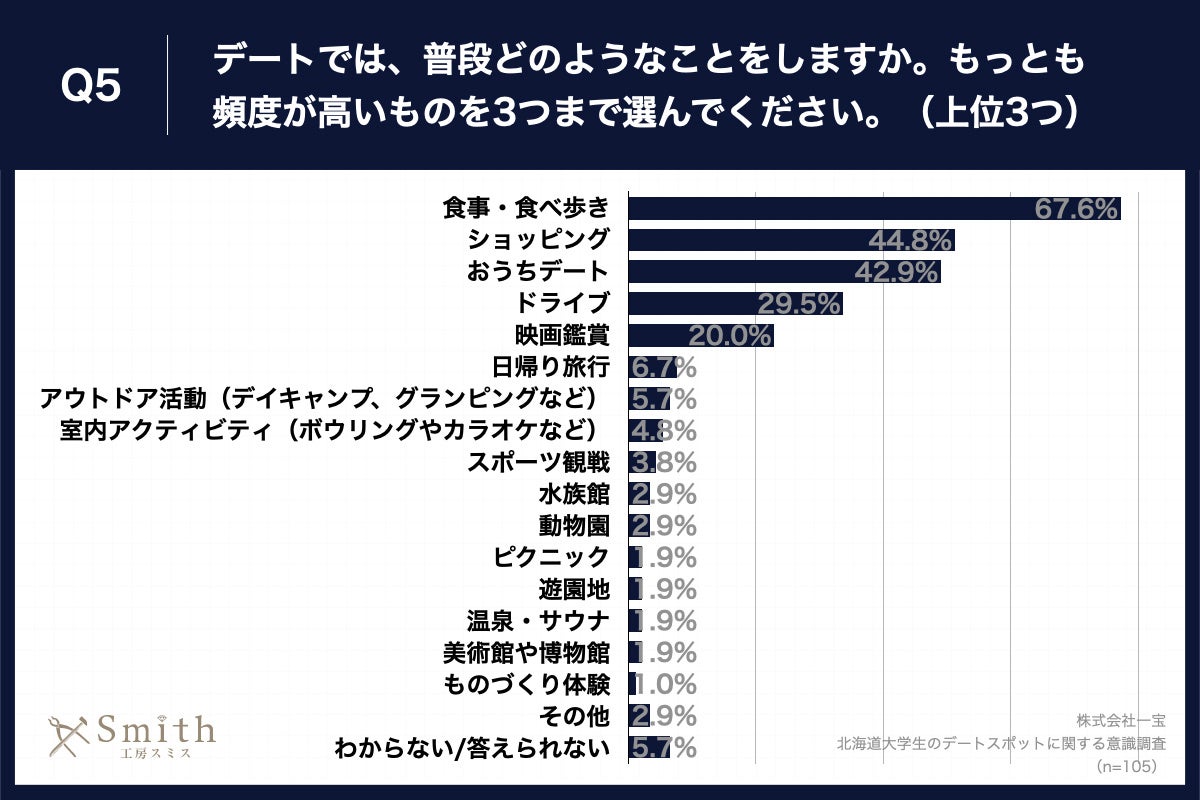 「Q5.デートでは、普段どのようなことをしますか。もっとも頻度が高いものを3つまで選んでください。(上位3つ)」(n=105)と質問したところ、「食事・食べ歩き」が67.6%、「ショッピング」が44.8%、「おうちデート」が42.9%という回答となりました。