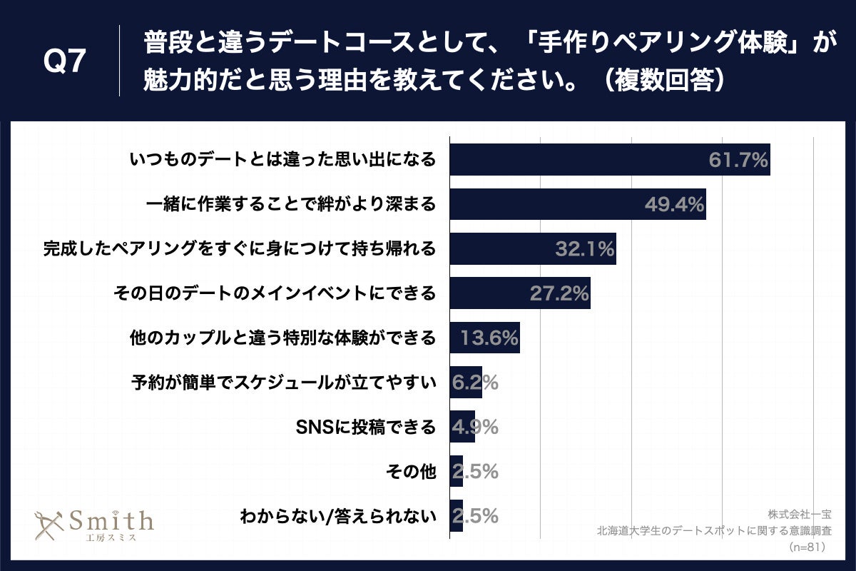 Q6で「とてもそう思う」「ややそう思う」と回答した方に、「Q7.普段と違うデートコースとして、「手作りペアリング体験」が魅力的だと思う理由を教えてください。(複数回答)」(n=81)と質問したところ、「いつものデートとは違った思い出になる」が61.7%、「一緒に作業することで絆がより深まる」が49.4%、「完成したペアリングをすぐに身につけて持ち帰れる」が32.1%という回答となりました。