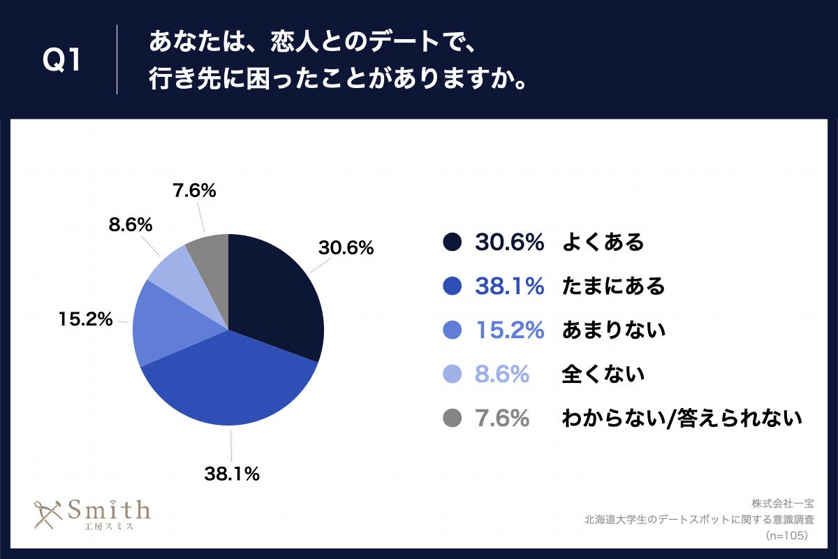 「Q1.あなたは、恋人とのデートで、行き先に困ったことがありますか。」(n=105)と質問したところ、「よくある」が30.6%、「たまにある」が38.1%という回答となりました。