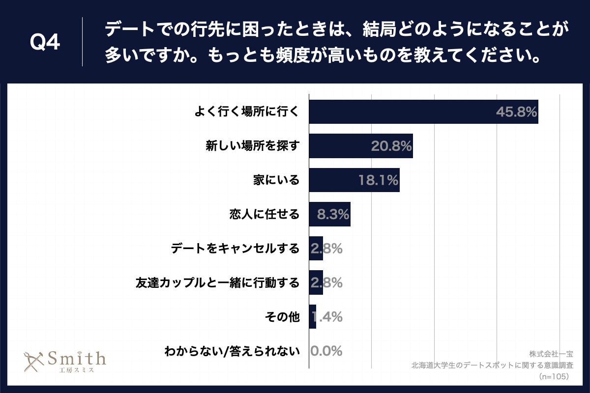 Q1で「よくある」「たまにある」と回答した方に、「Q4.デートでの行先に困ったときは、結局どのようになることが多いですか。もっとも頻度が高いものを教えてください。」(n=72)と質問したところ、「よく行く場所に行く」が45.8%、「新しい場所を探す」が20.8%という回答となりました。