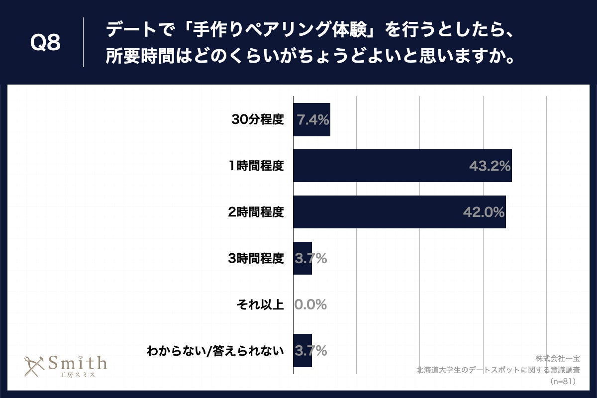 Q6で「とてもそう思う」「ややそう思う」と回答した方に、「Q8.デートで「手作りペアリング体験」を行うとしたら、所要時間はどのくらいがちょうどよいと思いますか。」(n=81)と質問したところ、「1時間程度」が43.2%、「2時間程度」が42.0%という回答となりました。