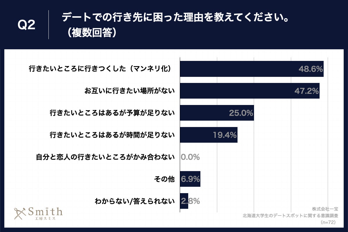 Q1で「よくある」「たまにある」と回答した方に、「Q2.デートでの行き先に困った理由を教えてください。(複数回答)」(n=72)と質問したところ、「行きたいところに行きつくした(マンネリ化)」が48.6%、「お互いに行きたい場所がない」が47.2%、「行きたいところはあるが予算が足りない」が25.0%という回答となりました。