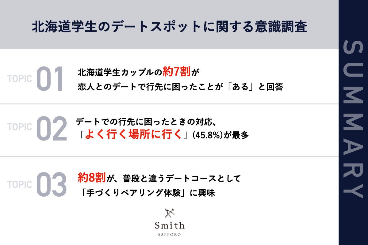 株式会社 一宝(本社:北海道札幌市)が運営する、手作り結婚指輪・婚約指輪・ペアリングの「工房Smith札幌」は、現在恋人がいる北海道在住の学生105名(札幌在住55.2%)を対象に、北海道の学生のデートスポットに関する意識調査を実施しましたので、お知らせいたします。