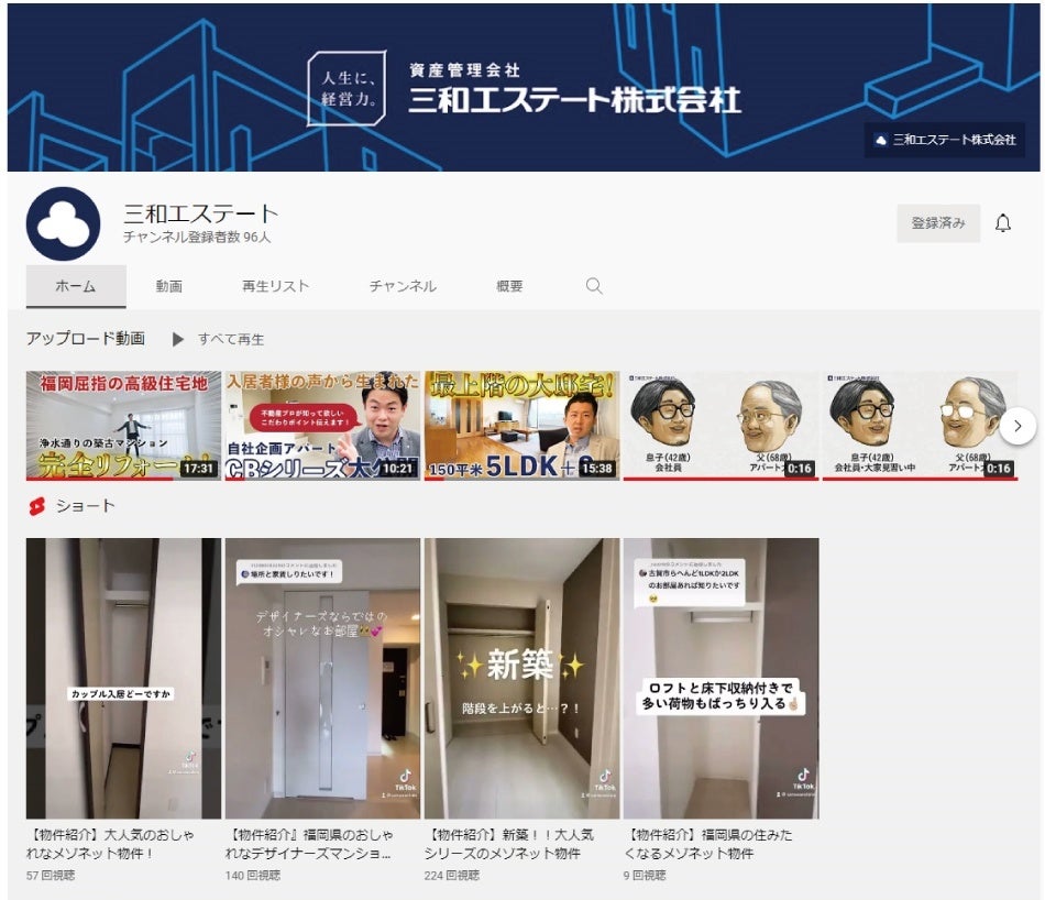 不動産資産管理の三和エステート株式会社(本社:福岡市博多区博多駅南1丁⽬、代表取締役社⻑:⽯井 清悟)は、独⾃の構造とデザイン性により、⾼い⼊居率を実現させる人気アパート「CBシリーズ」のルームツアー(お部屋/物件紹介)動画を公開しました。その他、事業コンセプトである「人生に、経営力。」をテーマにしたインタビューやセミナーなど動画による情報や不動産や投資に関する知見の配信は必見です。