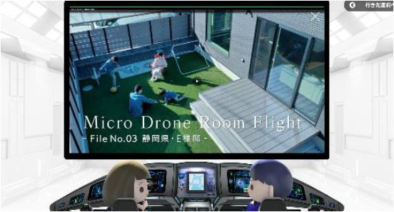 ドローンカメラで一条オーナー様のお住まいを紹介するパビリオンです。まるで鳥になったかのように家の中と外を縦横無尽に飛んで、一条オーナー様の暮らしの映像をいつもと違った視点で見ることができる、特別なルームツアーです。