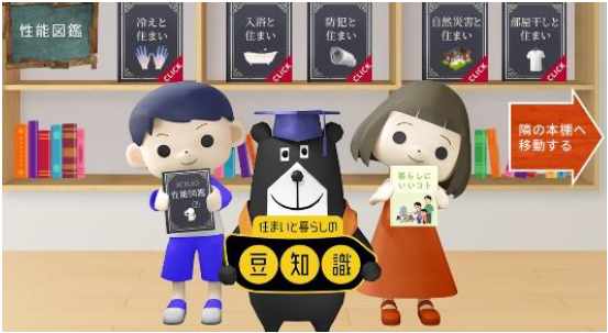 今の暮らしがちょっと豊かになる、お役立ち情報が満載のパビリオンです。「暮らしにいいコト」では、専門家が監修した生活のお悩みを解決する方法を、アニメでわかりやすく解説します。「性能図鑑」では暮らしと密接に関わる住まいの性能をひも解いていきます。