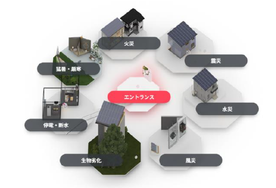 震災、水災、風災、火災、猛暑・厳寒、生物劣化、停電・断水といった様々な災害に対し、耐えるだけではなく“災害後もいつもとほぼ変わらない暮らしを維持”するための最新テクノロジーを、3Dのバーチャル展示や動画を用いて詳しく解説していきます。
