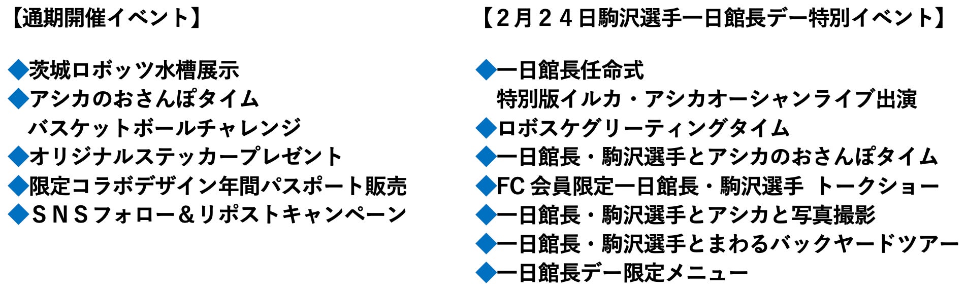 茨城ロボッツに今シーズンから加入し、中心選手として活躍を見せている駒沢颯選手を一日館長としてお招きし、特別版イルカ・アシカオーシャンライブへの出演や、バックヤードツアーへの参加など記念プログラムを実施いたします。普段はコート上で闘志あふれるプレーを見せてくれている駒沢選手の意外な一面を見ることができるかもしれません。駒沢選手ファン、茨城ロボッツファンだけでなく、多くの方に楽しんでいただけるスペシャルな一日になること間違いなしです。