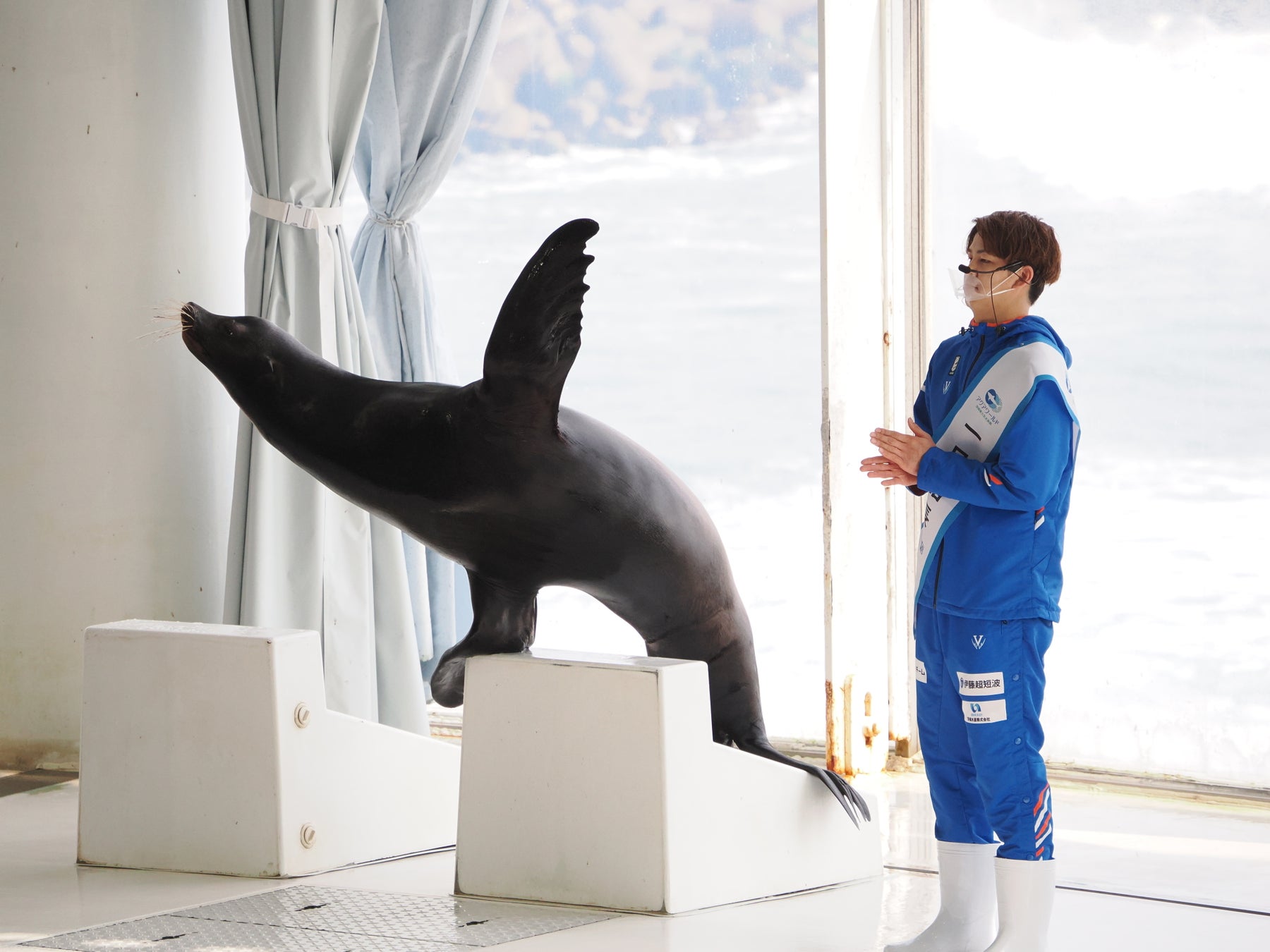 当館の人気プログラム「アシカと写真撮影」に駒沢選手が飛び入り参加。駒沢選手、カリフォルニアアシカと素敵な思い出の一枚を撮影してみてはいかがでしょうか。