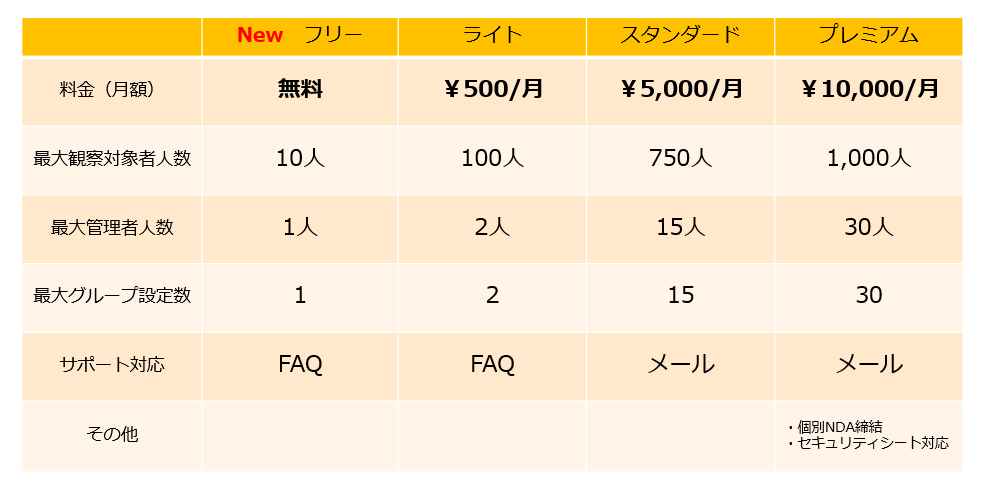 さらに今回、従来の料金プランでご要望の多かった「観察対象人数」・「管理者の人数」・「グループ数」の枠の見直しを行いました。これにより、料金は据え置きでこれまで以上に便利でリーズナブルにご利用いただけるようになりました。