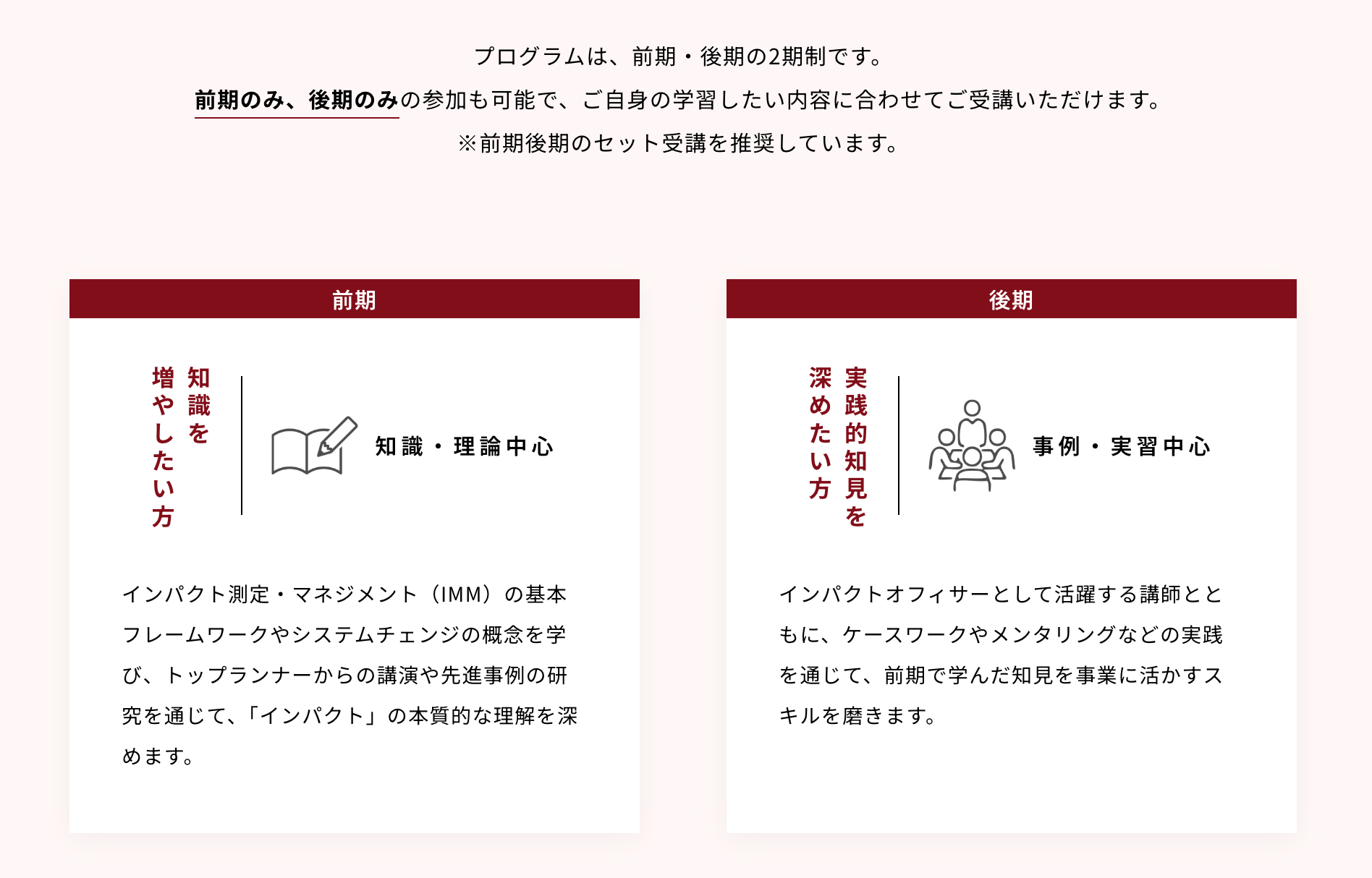 「インパクトオフィサー」となるための合計6ヶ月(前期3ヶ月 / 後期3ヶ月)の集中型プログラムです。