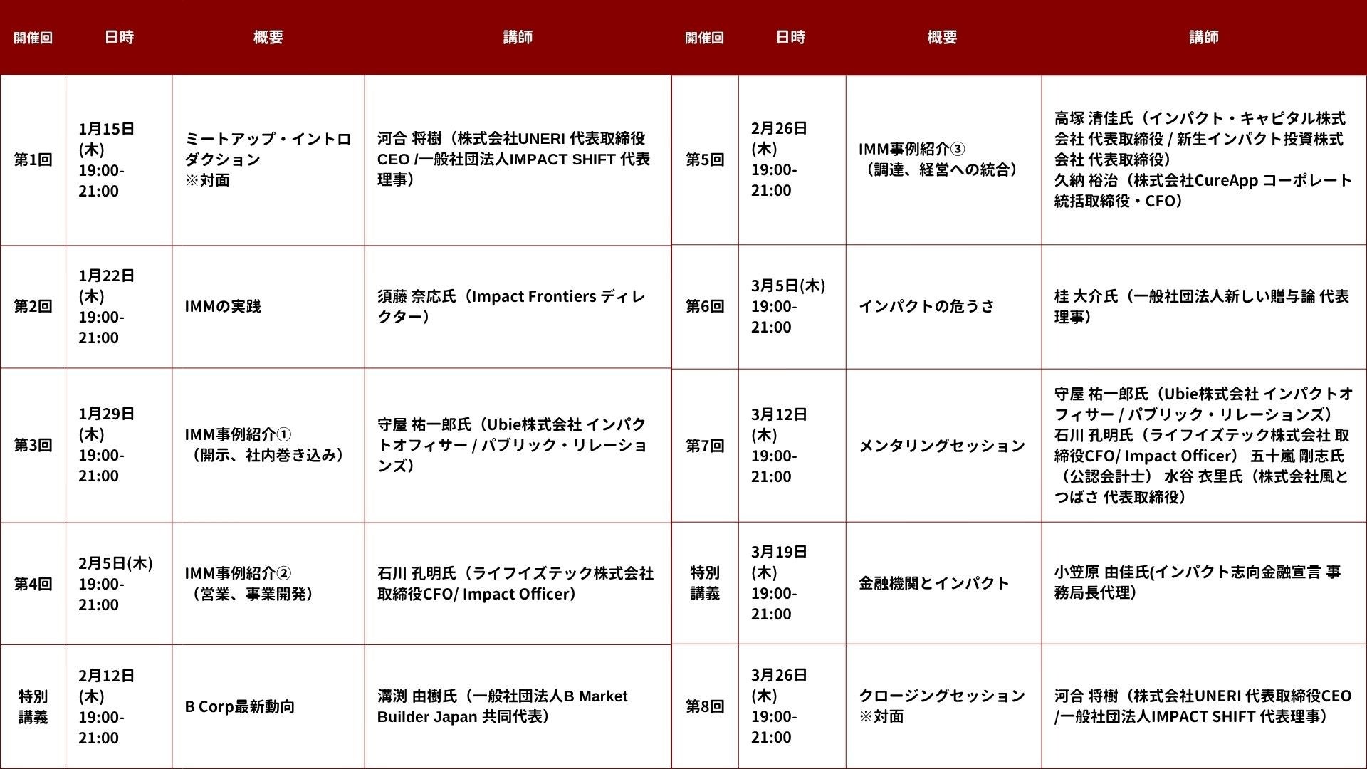 本プログラムでは、こうした国内先進事例の実践者を講師に招き、対話・ケースワーク・メンタリングを通じて、インパクトを事業・経営に実装するための学びと実践機会を提供します。