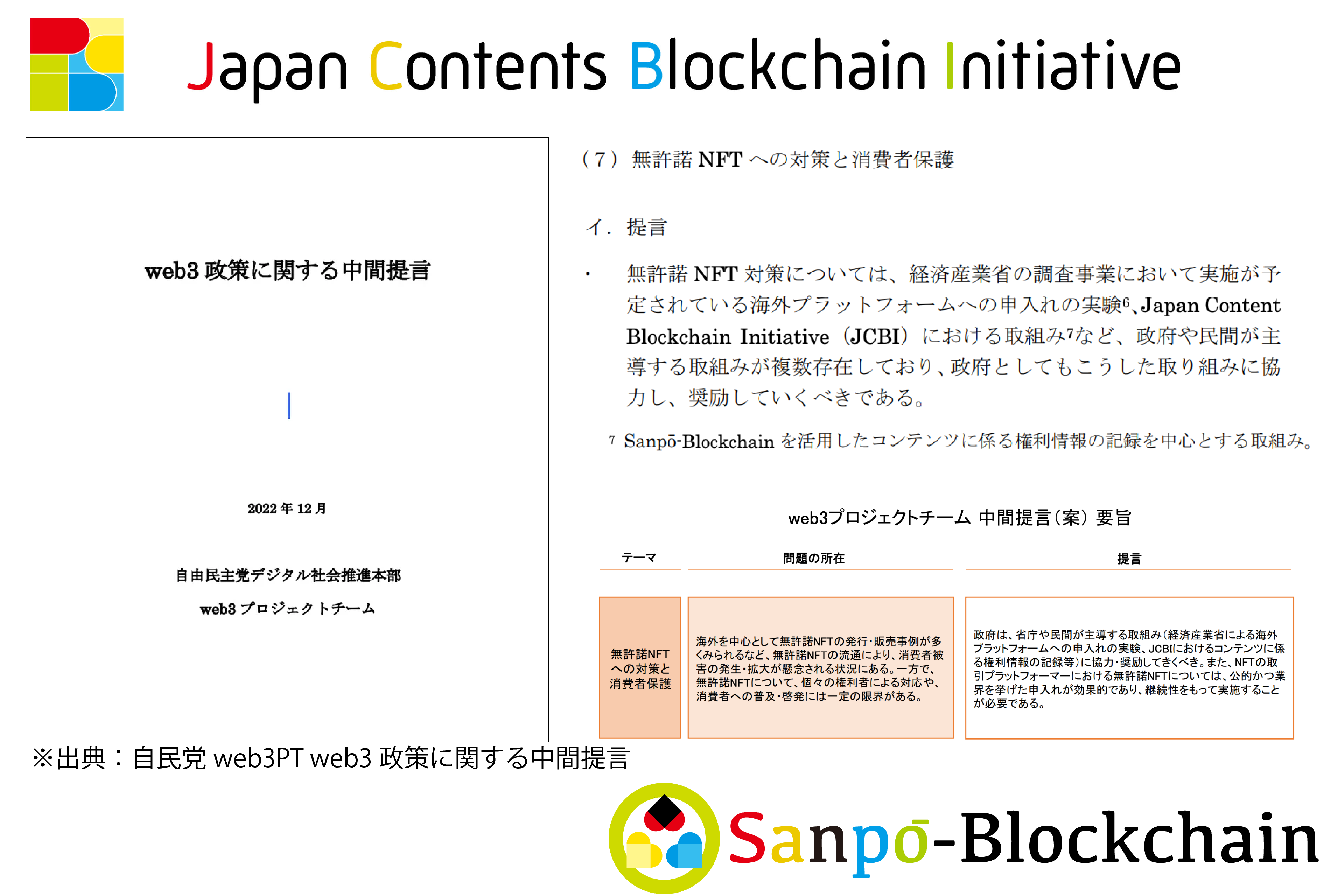 コンテンツ業界関連企業を中心に55社が加入する一般社団法人ジャパン・コンテンツ・ブロックチェーン・イニシアティブ(略称、一般社団法人JCBI)の著作権流通部会(部会長:骨董通り法律事務所 岡本健太郎弁護士、副部会長:株式会社メルカリ 永井幸輔弁護士、早稲田リーガルコモンズ法律事務所 稲村宥人弁護士、部員:PwC弁護士法人 柴田英典弁護士)がヒアリングを受けた、自由民主党 デジタル社会推進本部のWeb3PT(事務局長:塩崎彰久 衆議院議員)が取りまとめた「web3政策に関する中間提言」にて、Sanpō-Blockchainを活用したコンテンツに係る権利情報の記録を中心とする一般社団法人JCBIの取組みを、無許諾 NFT への対策と消費者保護の提言の中で取り上げていただきました。