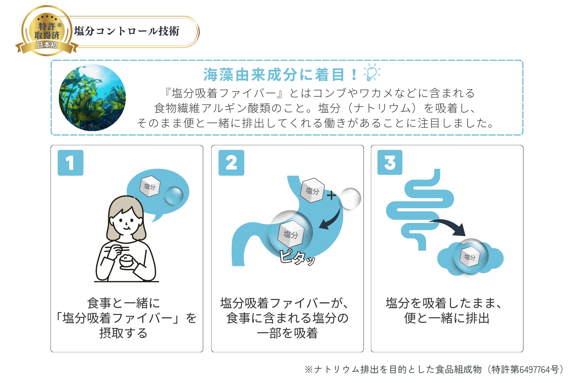 これらの減塩に関する悩みを解決するのが海藻由来成分である「塩分吸着ファイバー(食物繊維アルギン酸類)」を用いた当社の塩分コントロール技術です。