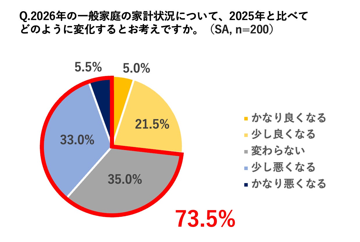 調査の結果、半数以上が2026年の世帯収入が「増加する」と回答する一方で、7割以上が家計状況は「良くならない」との見方を示し、収入の伸びを上回るペースで「値上げ(生活コスト増)」が進行し、実質的な家計の余裕は生まれないと分析していることが明らかになりました。