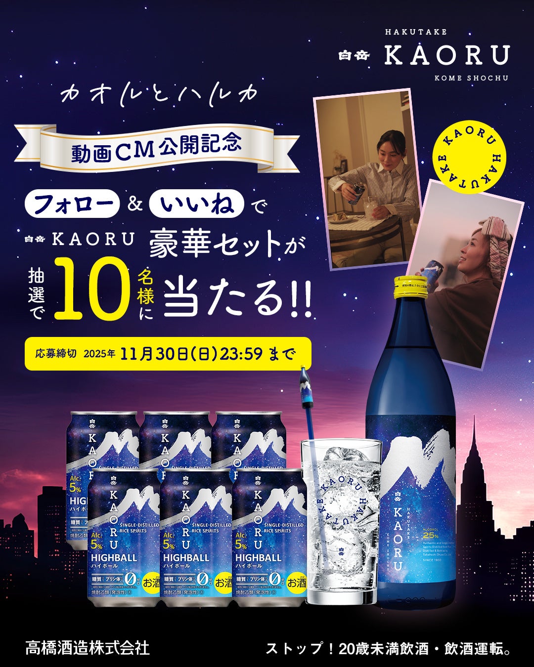 このたび、高橋酒造株式会社(本社:熊本県人吉市、代表取締役社長:高橋光宏)は、本格米焼酎ブランド「白岳KAORU」の縦型ショート動画CMを、2025年10月20日より関東・関西エリアを中心に順次公開いたします。