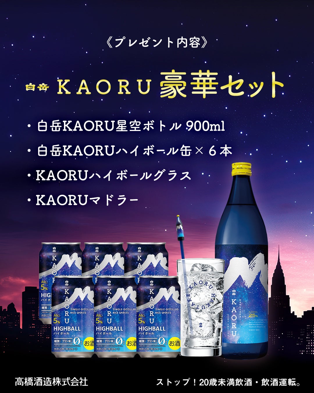 動画CM公開に先駆け、10月17日(金)よりInstagram限定キャンペーン「フォロー&いいねで当たる!白岳KAORU 豪華晩酌セット」を開催いたします。キャンペーン期間は11月30日(日)まで。星空ボトルやハイボール缶などが当たるほか、10月下旬からは動画CMに登場する“カオルとハルカ”の限定レシピ動画シリーズも順次公開予定です。