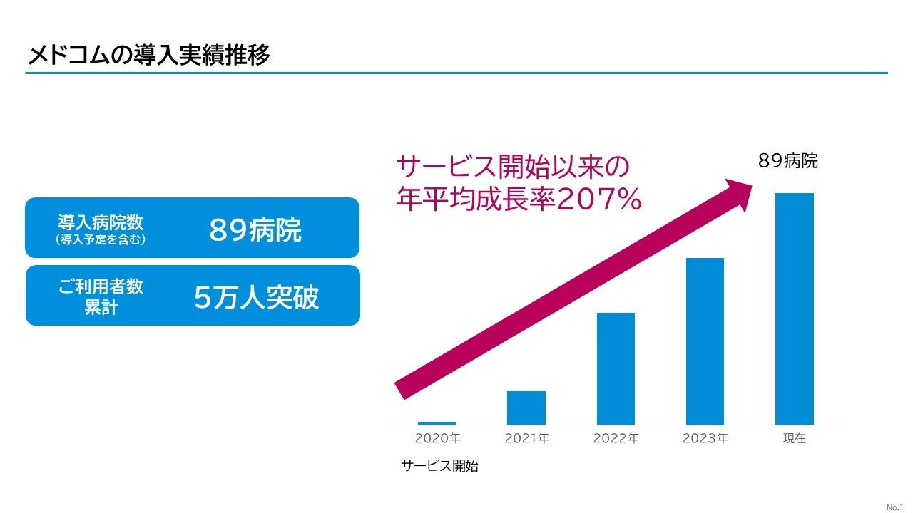 医療機関専用スマートフォン「メドコム」を提供する株式会社メドコムは、デジタルを活用した病院内の生産性向上への関心が高まる中、今年で導入病院数(導入予定含む)89病院へ、また利用者数が5万人を突破、サービス開始以来の年間平均成長率は207%となり、病院DXのニーズを受け事業が好調に推移していることをお知らせします。また、これまでAndroid端末に限定して提供しておりましたが、医療機関のニーズに応え新たにiPhoneにも対応し、2025年4月よりご利用いただけるようになることを発表します。