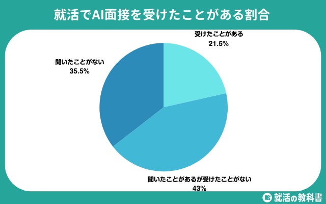 「AI面接を受けたことがある」と回答した人は21.5%と、約5人に1人に留まりました。これは、AI面接がまだ一部の企業に限定されており、就活全体に浸透しきっていないことを示しています。また、6割以上の就活生がAI面接を知っていることが分かりました。AI面接という言葉自体は浸透してきていると考えられます。