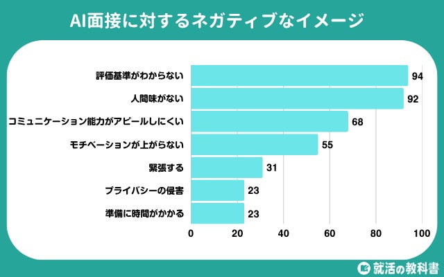 AI面接に対して最も多かったネガティブな印象は「評価基準がわからない」(94人)と「人間味がない」(92人)でした。どこを見られているのか不透明で、無機質な印象を受けることが、不安や不信感につながっているようです。