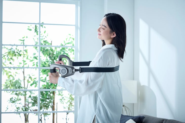 形の異なる5種類のアタッチメントで様々な筋肉にピンポイントにアプローチするだけでなく、ベルトアタッチメントに付け替えると、これまでのハンディタイプでは届きにくかった背中や腰、お尻などの広い面積の表層筋を「面」で振動させ一度に広範囲をケアすることができます。