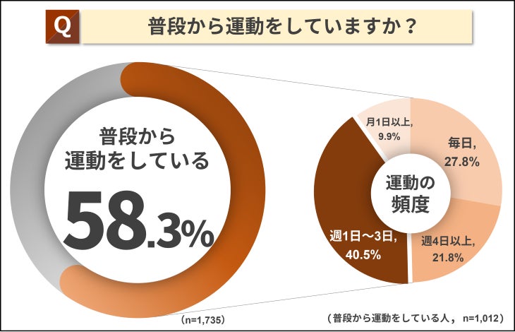 回答者全員へ「普段から運動をしていますか?」と質問したところ、58.3%の人が月に1回以上の運動を行っている結果となりました。その頻度については多かった順に「週1日~3日」(40.5%)、「毎日」(27.8%)、「週4日以上」(21.8%)、「月1日以上」(9.9%)と、普段から運動をしている人は頻度が高いことが分かりました。