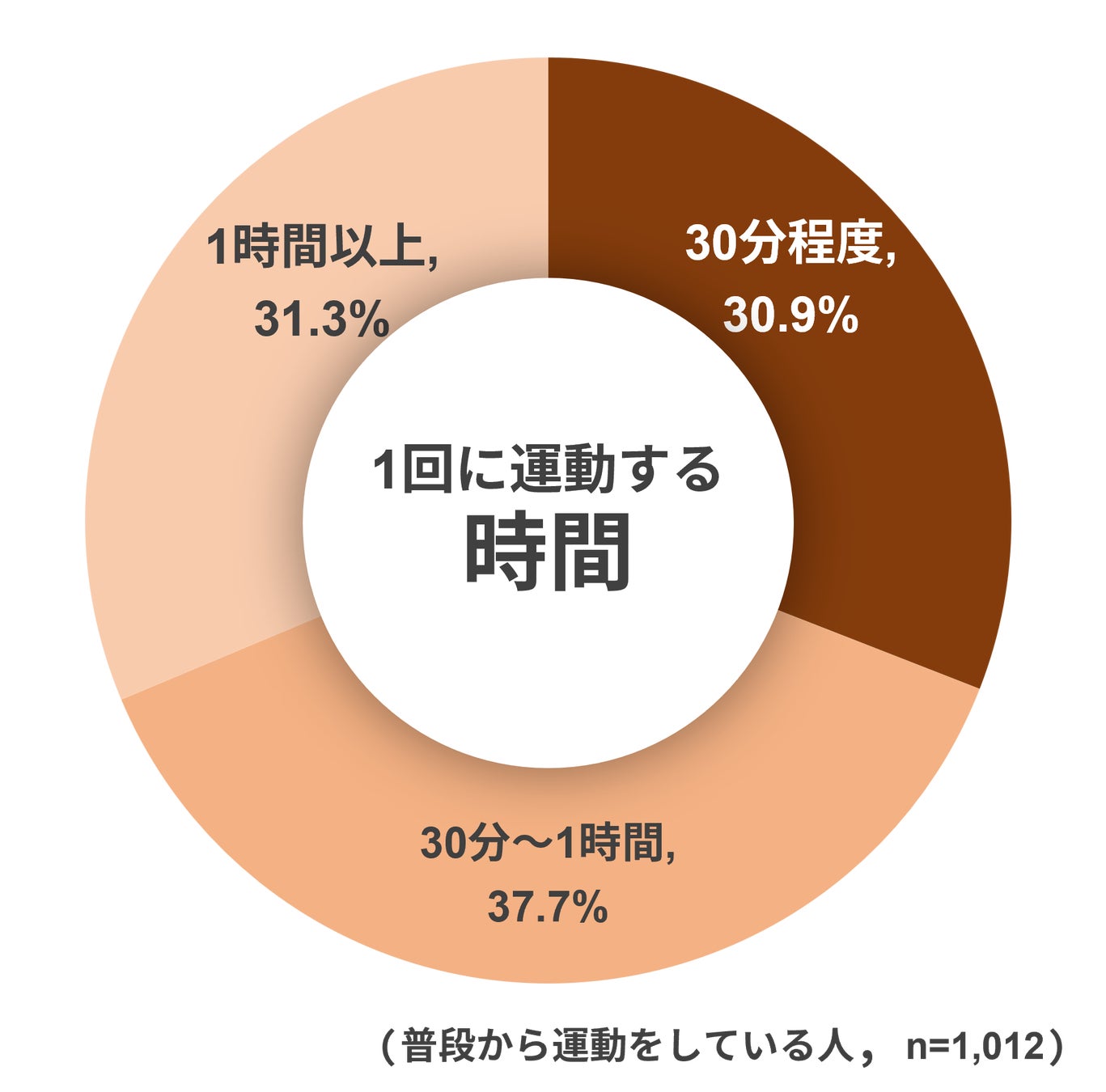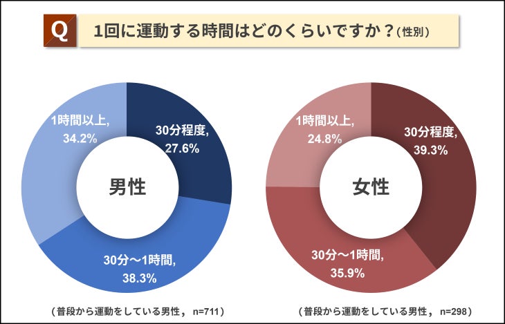 また、普段運動をしている人に「1回に運動する時間はどのくらいですか?」と質問したところ、「30分程度」が30.9%、「30分~1時間」が37.7%、「1時間以上」が31.3%という回答で、割合に大きな偏りはありませんでした。