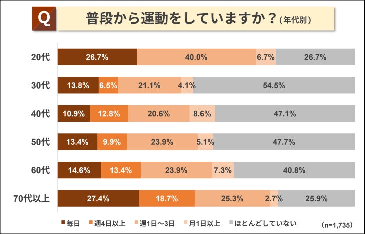 年代別に見ると、普段から運動している人が最も多いのは70代以上で74.1%、反対に最も少ないのは30代の45.5%で、その差は28.6ポイントでした。