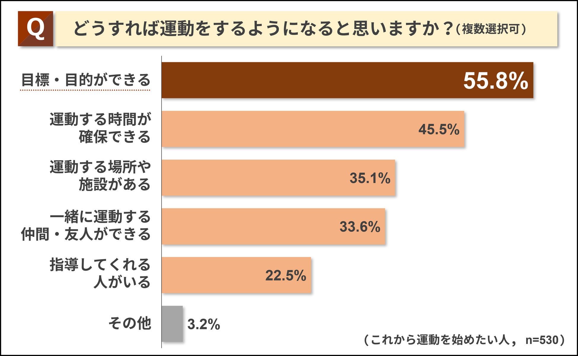 また運動を始めたいと思っている人に、どうすれば運動をするようになると思うか質問したところ、多かった順に「目標・目的ができる」(55.8%)、「運動する時間が確保できる」(45.5%)、「運動する場所や施設がある」(35.1%)という結果でした。