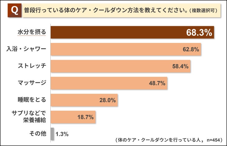 また、「体のケア・クールダウンを行っている」と答えた人にどのようなケア・クールダウンをしているか質問したところ、「水分を摂る」が最も多く、その割合は68.3%でした。次いで「入浴・シャワー」(62.8%)、「ストレッチ」(58.4%)という結果となりました。