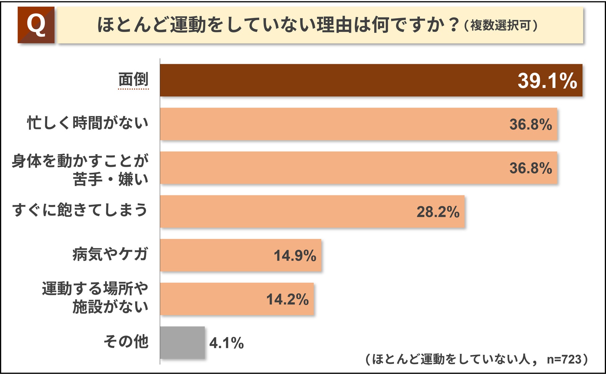 「普段から運動をしていますか?」という質問に対し「ほとんど運動をしていない」と回答した人へ運動をしていない理由を聞いたところ、主な理由として「面倒」(39.1%)、「忙しく時間がない」(36.8%)、「身体を動かすことが苦手・嫌い」(36.8%)という結果になりました。
