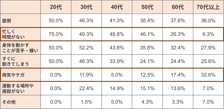 年代別で見ると、「忙しく時間がない」という回答は低い年代になるにつれて多く、反対に「病気やケガ」という回答は年代が高くなるにつれて増える傾向があるようです。