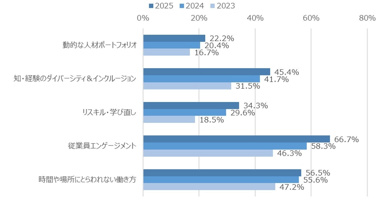 人材版伊藤レポートでは、人材戦略に求められる3つの視点(3P)と5つの要素(5F)で構成される「3P・5Fモデル¹」が提唱されています。直近3年間連続して本サーベイに参加している企業のうちプライム上場108社を対象に、人的資本経営とその開示の取組み状況を、5つの要素(5F)に合わせて確認すると、全ての項目において3年連続で取組みが進んでいました(図表3)。ただし、5Fの中でも進捗に差が出ており、「従業員エンゲージメント」「時間や場所にとらわれない働き方」に比べて、「動的な人材ポートフォリオ」項目では取組みが広がっていませんでした。