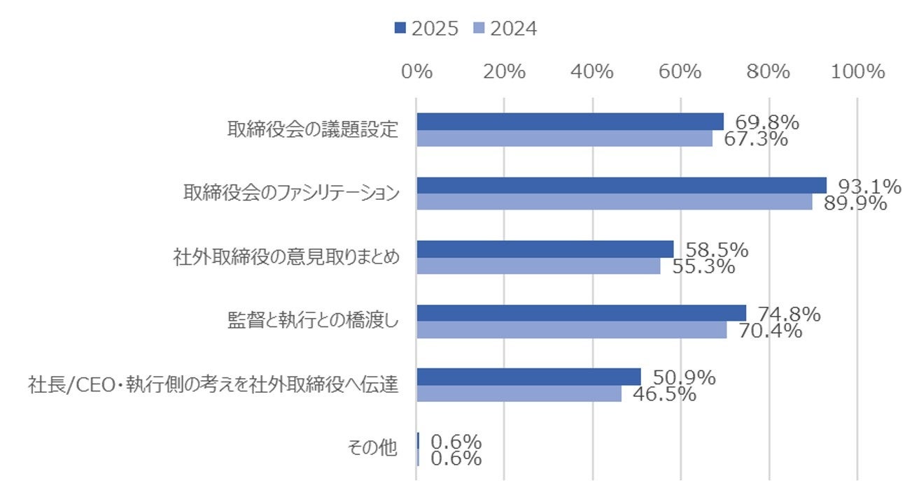取締役会議長に期待する役割は、「取締役会のファシリテーション」(93.1%)を挙げる企業の割合が最も高く、全項目で昨年より増加。