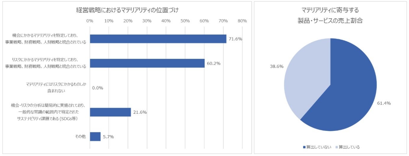 マテリアリティを特定・公表している88社を対象に、経営戦略におけるマテリアリティの取組みの位置づけを調査した結果、6割以上の企業において機会・リスクの両面からマテリアリティが特定され、経営戦略に統合されていました(図表13)。この結果は企業においてサステナビリティ経営が遂行されていることを示す一方で、マテリアリティ解決に寄与する製品・サービスの売上割合については6割の企業が算出しておらず、企業にとっての成長機会に関するマテリアリティの定量的な評価・管理はまだ十分に整備されていないことがうかがえます。
