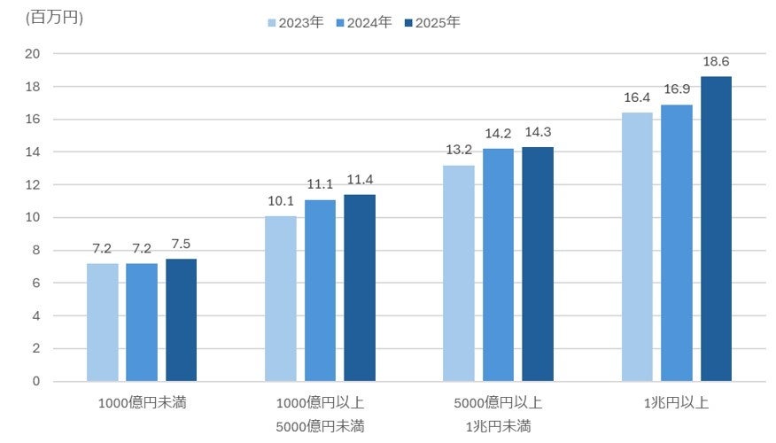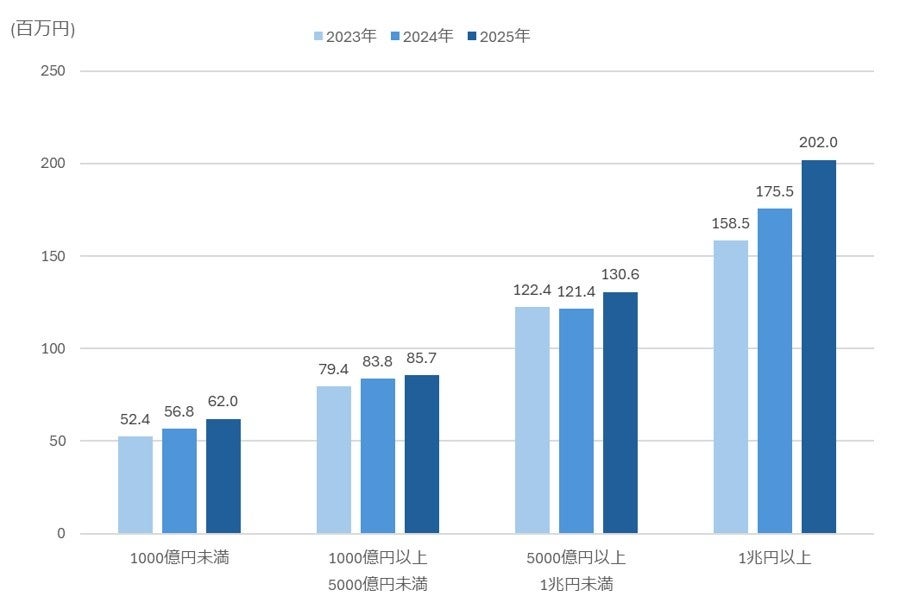 社外取締役の総報酬額(中央値)も増加傾向で、特に時価総額1兆円以上の企業群で顕著。