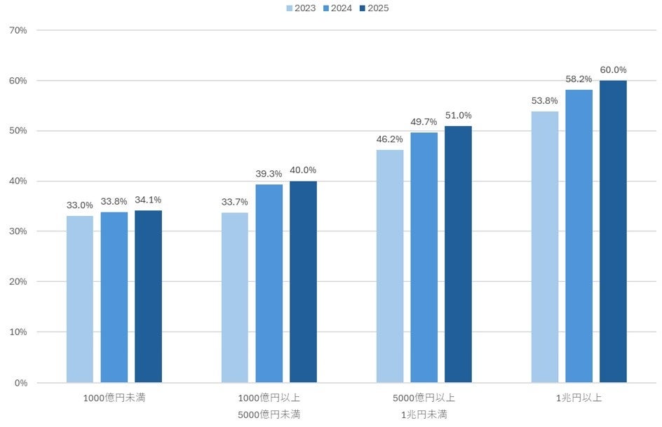 社長の総報酬額およびインセンティブ報酬(変動報酬)の構成比率は、直近3年間で増加傾向(いずれも中央値)。特に時価総額1兆円以上の企業群では総報酬額約2億円(昨年比15.1%増)、変動報酬比率60.0%(同1.8%pt増)と最も大きく伸長。