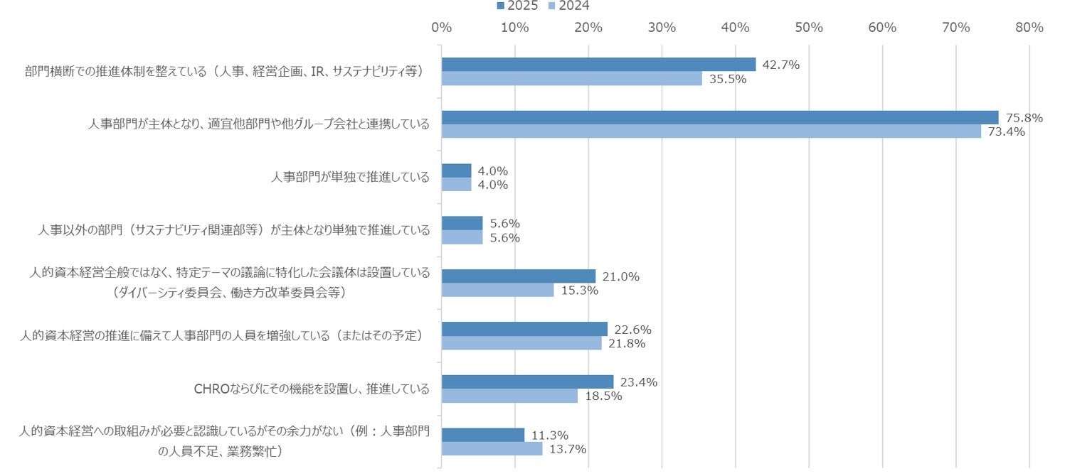 直近2年間連続して本サーベイに参加している企業のうちプライム上場124社について、人的資本経営の推進体制は、人事部門が核となり各部門と都度連携をとる形が現状多く75.8%に達していますが、部門横断での推進体制整備も昨年比7.2%pt増と大きく進んでいます(図表4)。また、CHROを設置し経営アジェンダとして推進する企業が昨年から大きく増加しており、経営アジェンダとしての重要性が高まっていることがわかります。