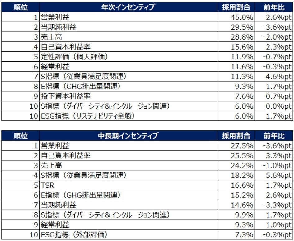 インセンティブ報酬の評価指標では、株主価値を直接反映するTSR(株主総利回り)の採用が拡大。加えて、E(環境)指標「GHG排出量関連」やS(社会)指標「従業員満足度関連」など定量化しやすい将来財務指標(非財務指標)の採用も目立つ。