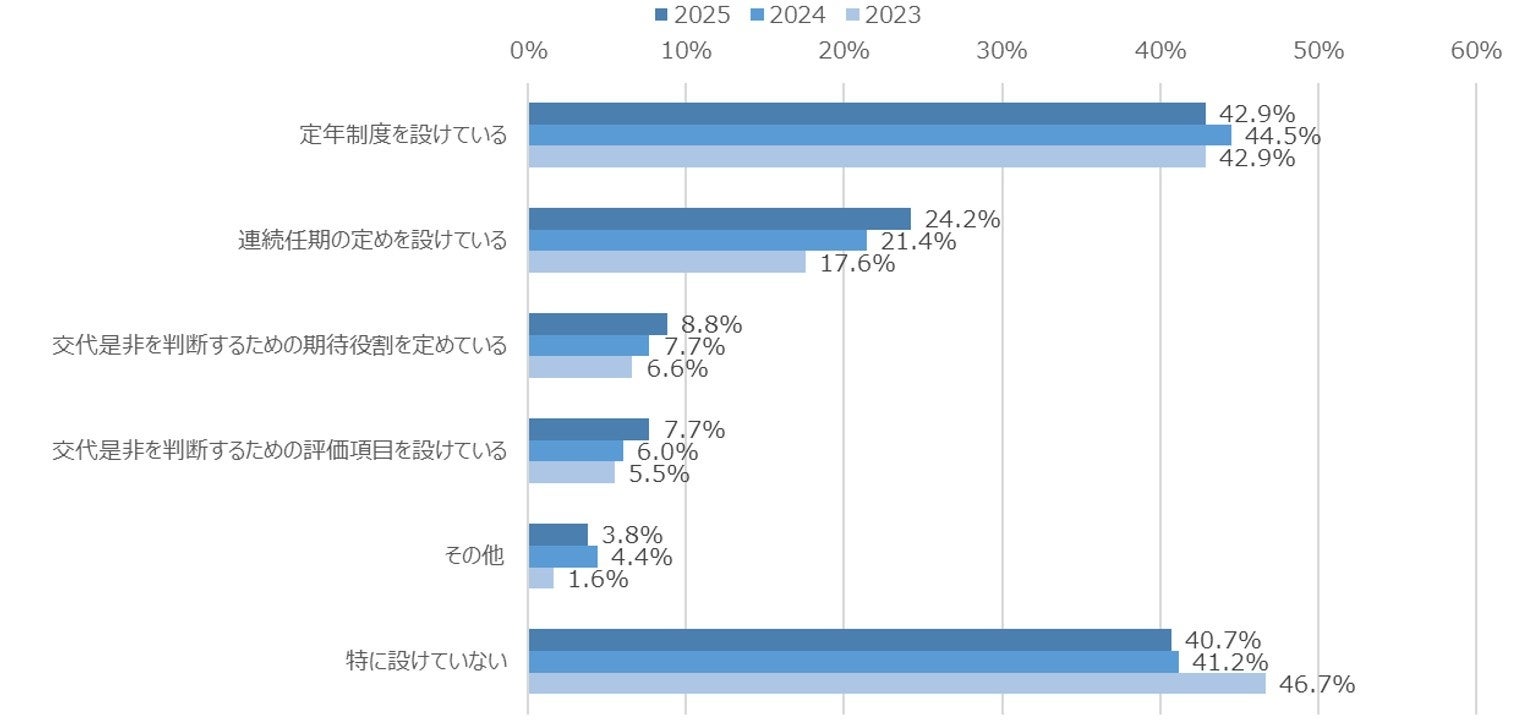 直近3年間連続して本サーベイに参加している182社を対象に、社長の交代に関する基準を集計したところ、「定年制度を設けている」が42.9%と最も多くみられました(図表6)。また、「連続任期の定めを設けている」は昨年比2.8%pt増と最も大きく増加し24.2%でした。一方、「交代是非を判断するための期待役割を定めている」(8.8%)、「交代是非を判断するための評価項目を設けている」(7.7%)は1割未満にとどまるものの、3年連続で増加しました。